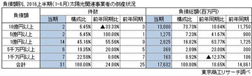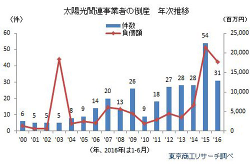中國(guó)儲(chǔ)能網(wǎng)訊:調(diào)查公司東京商工研究8月2日宣布,2016年上半年(1~6月)“太陽(yáng)能相關(guān)企業(yè)”的倒閉數(shù)量同比增加24.0%,為31家。是2000年以后上半年倒閉數(shù)量最多的一次。