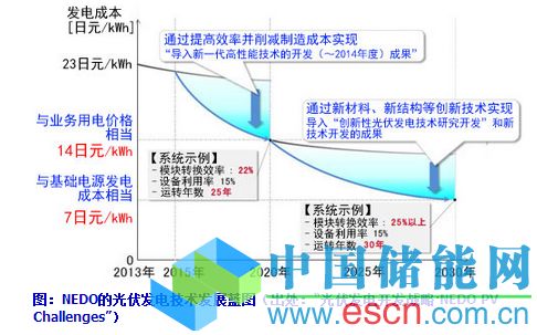 對新一代光伏發(fā)電領(lǐng)域的技術(shù)影響,戰(zhàn)略中寫明了“轉(zhuǎn)換效率要提高至目前普及的光伏發(fā)電的2倍、;通過降低制造和設(shè)置成本并大幅提高發(fā)電效率,實(shí)現(xiàn)與基礎(chǔ)電源相當(dāng)?shù)陌l(fā)電成本(7日元/kWh)。這些影響預(yù)測與NEDO(新能源產(chǎn)業(yè)技術(shù)綜合開發(fā)機(jī)構(gòu))2014年9月發(fā)布的“光伏發(fā)電開發(fā)戰(zhàn)略(NEDOPVChallenges)”是相協(xié)調(diào)的(圖)。