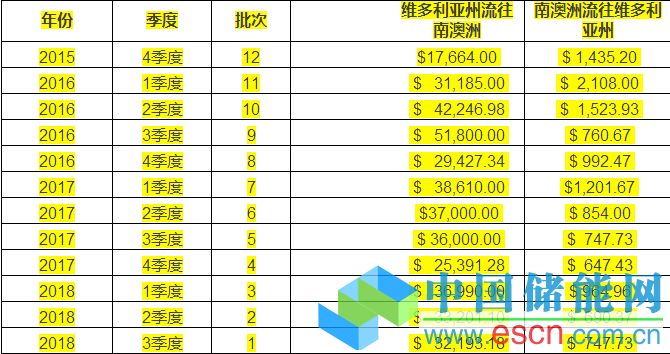 澳大利亞維多利亞州與南澳洲之間有兩條輸電線路相連。維多利亞州流往南澳洲方向的跨州結余總點數(shù)在2017年第4季度之前是700點,然后由于線路擴容增加至880點。相反方向,即南澳洲流往維多利亞州方向的跨州結余總點數(shù)在擴容前是400點,擴容后增加至770點。澳大利亞能源市場運營中心于2015年9月15日公布從2015年第4季度到2018年第3季度共12個季度的跨州結余競價拍賣結果(見下表)。2015年第4季度跨州結余是最后批次拍賣,其它批次已在以前的拍賣出售,而2018年第3季度則是第一批次拍賣。表右側兩列分別是維多利亞州流往南澳洲方向與南澳洲流往維多利亞州方向的每個季度跨州結余單位點數(shù)價格(澳元)。維多利亞州流往南澳洲方向跨州結余價格遠高于其反方向的價格。這是因為在多數(shù)用電高峰時,南澳洲是受電州,維多利亞州是送電州。第一季度的跨州結余價格高于其它季度,反映南半球夏季電力供需緊張局面。值得注意的是2016年第2季度的價格明顯高于第1季度的價格,這是因為南澳洲的一個520兆瓦火電廠將在第1季度結束后退役,電力供應進一步趨緊。由于能源市場運營中心調高了跨州結余總點數(shù),導致單位點數(shù)價格下降,從2017年第4季度往后的跨州結余價格都低于前一年相同季度的價格。