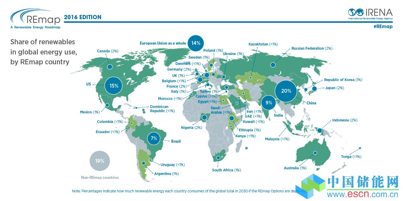 中國儲能網(wǎng)訊:援引國際可再生能源署(International Renewable Energy Agency,IRENA)的一則新報道,到2030年,如全球可再生能源的比例翻一番,將最多可節(jié)省4.2萬億美元,這一數(shù)字是為之付出成本的15倍。REmap:可再生能源路線圖 (Roadmap for a Renewable Energy Future)在今天的柏林能源轉(zhuǎn)型對話(Berlin Energy Transition Dialogue)上正式發(fā)布。該路線圖提出技術(shù)方案,來實現(xiàn)到2030年,將可再生能源在全球能源結(jié)構(gòu)中的占比從目前的稍高于18%提升至36%。