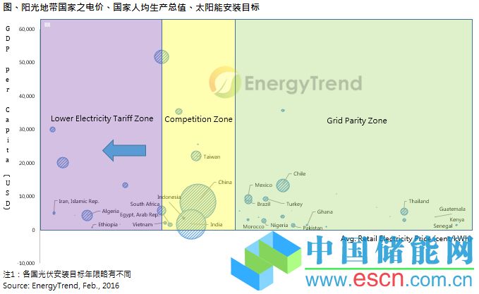 目前太陽帶地區(qū)里約有48%的國家進入市電同價區(qū)、33%的國家進入電價競爭區(qū)、19%的國家之太陽能發(fā)電電價則仍高于市電。部分人均生產(chǎn)總值低于US$10,000以下的國家,其經(jīng)濟發(fā)展成長促使電力需求提高,以公共事業(yè)級太陽能電站取代部分傳統(tǒng)電力的需求更為明顯,因此對太陽能安裝目標設(shè)定較高。
