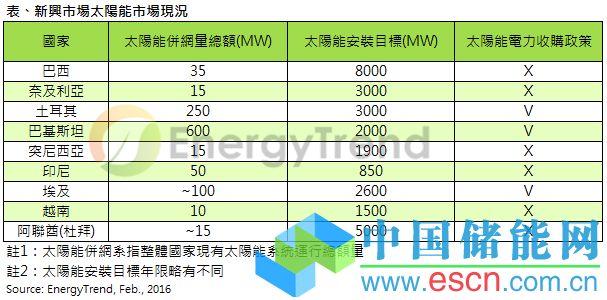 :部分太陽帶地區(qū)(Sunbelt region)的國家為因應(yīng)減碳與經(jīng)濟成長因素,上調(diào)可再生能源目標,分別計劃于2020~2030年間達成,使太陽帶地區(qū)國家安裝目標總額突破400GW。TrendForce旗下新能源事業(yè)處EnergyTrend分析師林建翰表示,隨著太陽能價格逐漸下滑、補貼方案釋出,新興市場對太陽能系統(tǒng)的需求潛力將更加顯著,預(yù)期未來5年能成為下一批成熟的市場。