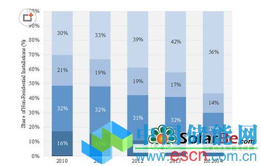 這種投資動向隨著時間的推移呈現(xiàn)出加劇趨勢。2010年,非居民用電太陽能發(fā)電廠裝機容量總和的70%都是小于1兆瓦的項目,而到了2014年,這個比例下降至44%。
