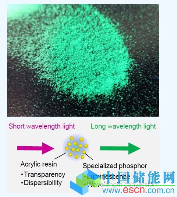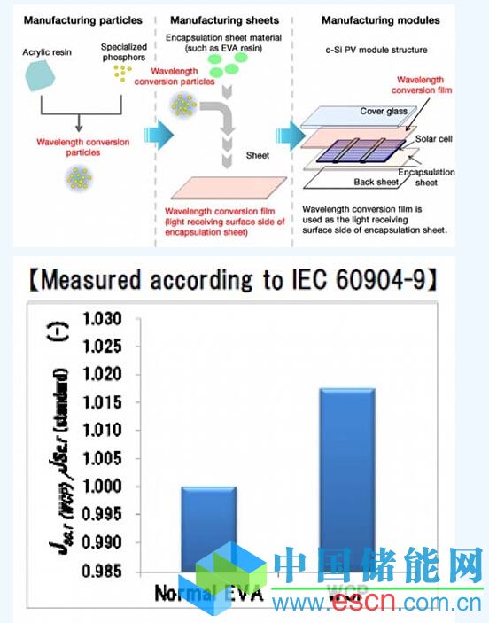 該公司表示,材料制造商將分布在丙稀酸樹脂粒子內(nèi)的熒光材料與EVA封裝片材混合,獲得短波長光(紫外線),并且將其轉(zhuǎn)換為長波長光(可見光),對現(xiàn)有薄膜配方的耐久性沒有影響。