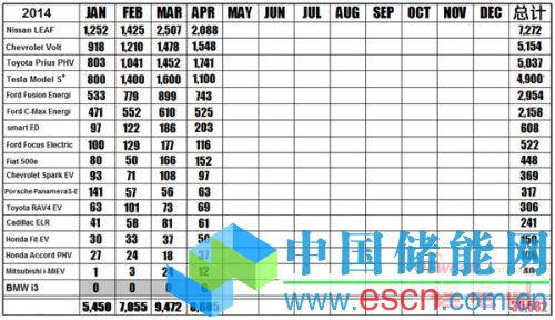 美國2014年1至4月電動汽車銷量統(tǒng)計(單位:臺)