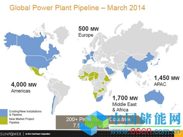 SunPower指出,其項(xiàng)目?jī)?chǔ)備包括美洲4GW,中東和北非地區(qū)1.7GW,亞太地區(qū)1.45GW,主要在日本和中國(guó),歐洲500MW。SunPower的項(xiàng)目?jī)?chǔ)備量自2013年五月起增加1.5GW。