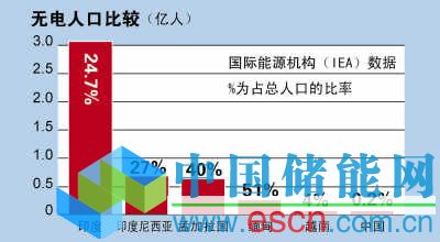 中國儲(chǔ)能網(wǎng)訊:亞洲2個(gè)大國中國和印度,在電力供應(yīng)方面存在巨大的差距。國際能源署(IEA)最近公布的《世界能源展望》顯示,從無法使用電力的人口占總?cè)丝诘谋壤齺砜矗?011年中國已經(jīng)基本為零,而印度則達(dá)到約25%(3億人)。尤其是在農(nóng)村地區(qū)的電力供給率方面,印度存在巨大差距。