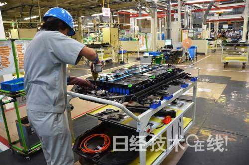 之后將車(chē)開(kāi)到名古屋制作所內(nèi)的岡崎工廠(chǎng)中,更換作業(yè)在生產(chǎn)歐藍(lán)德PHEV時(shí)組裝電池的場(chǎng)所進(jìn)行。該場(chǎng)所目前處于未生產(chǎn)的空閑狀態(tài)。用升降臺(tái)將車(chē)輛抬起,每輛車(chē)輛主要由兩名作業(yè)人員從車(chē)輛下方擰開(kāi)螺絲、拆下電池組。