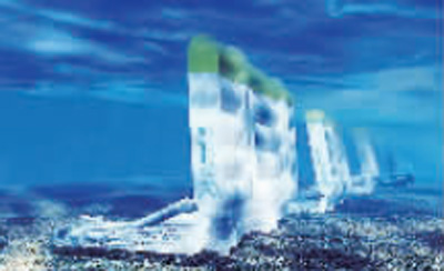 如圖所示,蘇格蘭當(dāng)前項(xiàng)目準(zhǔn)備的更新一代Oyster波浪發(fā)電機(jī)目前正在研發(fā)中。每只“牡蠣”,也就是技術(shù)層面上所知的振蕩浪涌轉(zhuǎn)換器(OWSC),安裝在海底的一個(gè)巨大杠桿,在海浪中來(lái)回?fù)u擺。它在海水深達(dá)30至50英尺的岸邊運(yùn)轉(zhuǎn)。高效率的機(jī)器可以成群安放,在極端天氣下也能工作。