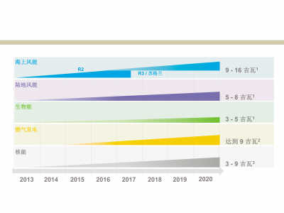 1英國可再生能源發(fā)展路線圖,2012年12月。根據未來能源需求,成本軌跡、工業(yè)領域所能達到的部署水平,每項可再生能源發(fā)電技術現有發(fā)電能力較小。