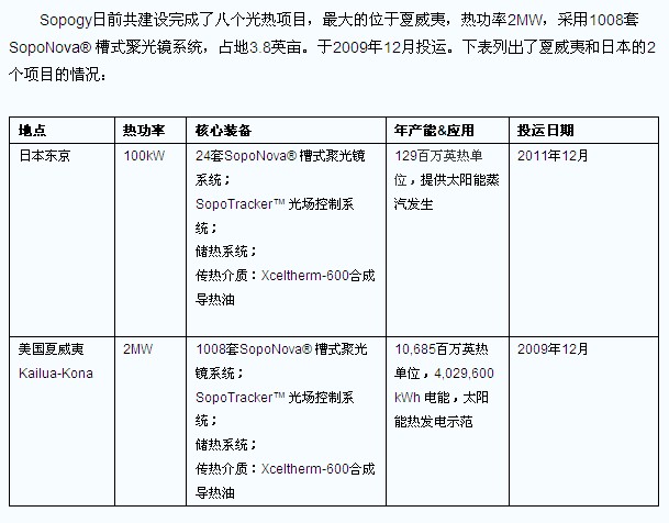 另外,Sopogy在德克薩斯州、墨西哥、巴布亞新幾內亞、亞利桑那州、加利福尼亞州、阿聯(lián)酋分別建設了一個項目,主要應用方向是太陽能空調和太陽能蒸汽發(fā)生、工業(yè)用熱等熱利用領域。