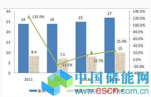 圖2 2011-2014年我國(guó)太陽(yáng)能電池產(chǎn)量、增長(zhǎng)率及全球太陽(yáng)能電池產(chǎn)量