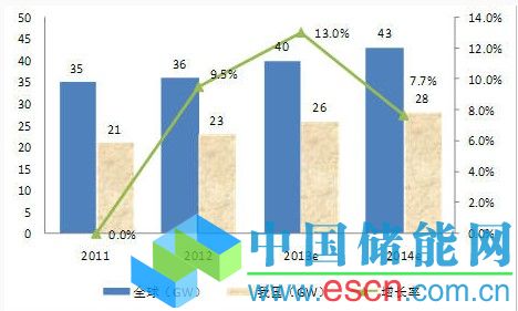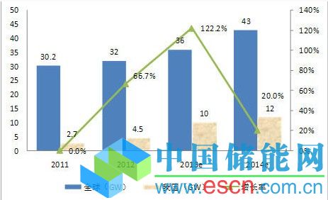 圖3 2011-2014年我國(guó)光伏新增裝機(jī)量、增長(zhǎng)率及全球新增裝機(jī)量