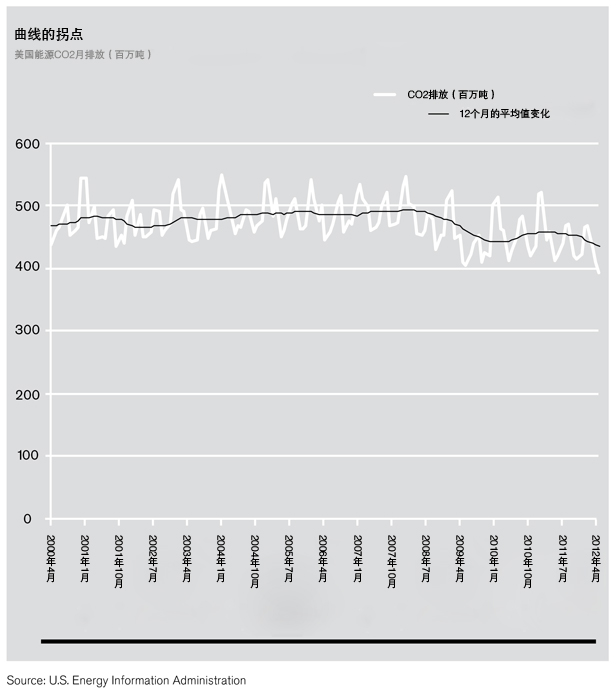 在圖表中,一年間的波動(dòng)反映了用電量急劇上升的情形,尤其是在很冷和很熱的季節(jié)。黑線為12個(gè)月的平均值變化。由于全球經(jīng)濟(jì)萎縮,碳排放曾于2009年顯著下降,并在2010年反彈,而當(dāng)前則表現(xiàn)為逐步回落。