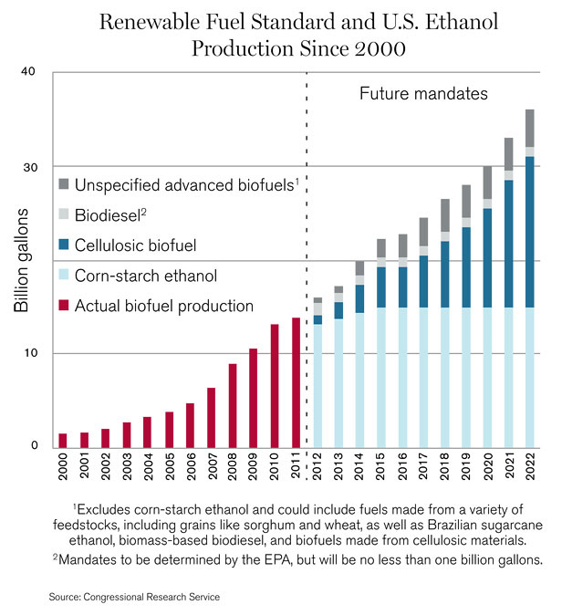 2013年,更多的幾家工廠應(yīng)該開始商業(yè)化生產(chǎn),但是,很難相信,生物燃料工業(yè)會接近生產(chǎn)10億加侖,這就是這一年的目標(biāo),是國會在2007年設(shè)定的。而2022年規(guī)定的生物燃料總產(chǎn)量是360億加侖,其中,160億加侖是纖維質(zhì),看來每年都更不現(xiàn)實了。
