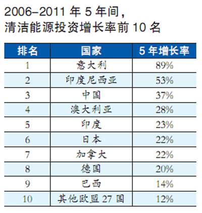在20國集團中,印度清潔能源增速驚人,其清潔能源投資上漲54%,達到102億美元,這主要是由于印度推行的“國家太陽能使命”項目,該項目計劃到2020年將印度國內(nèi)太陽能裝機容量增至20吉瓦。日本清潔能源投資額較2010年上漲23%,至86億美元,預(yù)計未來日本對清潔能源的投資將進一步加大。