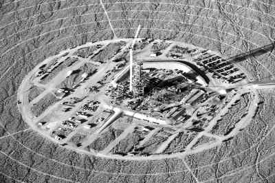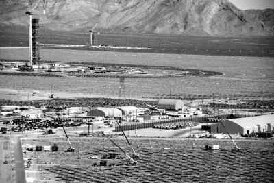 伊萬帕太陽能熱電廠占地1400多公頃,就在拉斯維加斯附近。它使用排列成同心圓的凹面鏡陣,把太陽光聚焦到中央塔,形成高溫,產(chǎn)生蒸汽。這座太陽能熱電廠采用三座中央塔,每座塔都有自己的一組凹面鏡。第一組機組在前部,今年2月完工,工人們已開始安裝凹面鏡,在圖中左上角和場地右側。 |