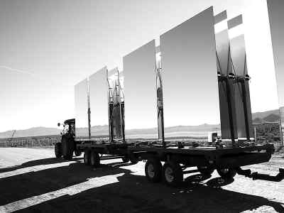 一旦它們完工,定日鏡就會被拖出來,拖到凹面鏡場地,這要用拖拉機。 |