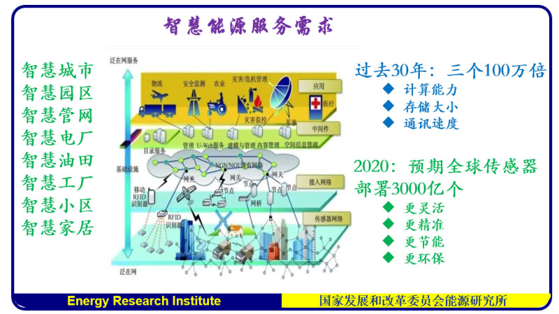 我們看國際上,過去30年,三個(gè)100萬倍,未來30年,再提高100萬倍,對我們能源系統(tǒng)是什么樣的沖擊?預(yù)期全球傳感器到2020年將部署3000億個(gè)。