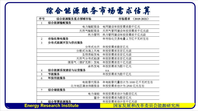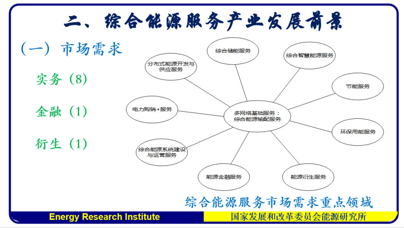 今年5月,發(fā)改委發(fā)了《國家發(fā)改委、科技部關(guān)于構(gòu)建市場導(dǎo)向的綠色技術(shù)創(chuàng)新體系的指導(dǎo)意見》,搞十百千工程,將來這個(gè)十百千,是綜合能源服務(wù)的提供者。