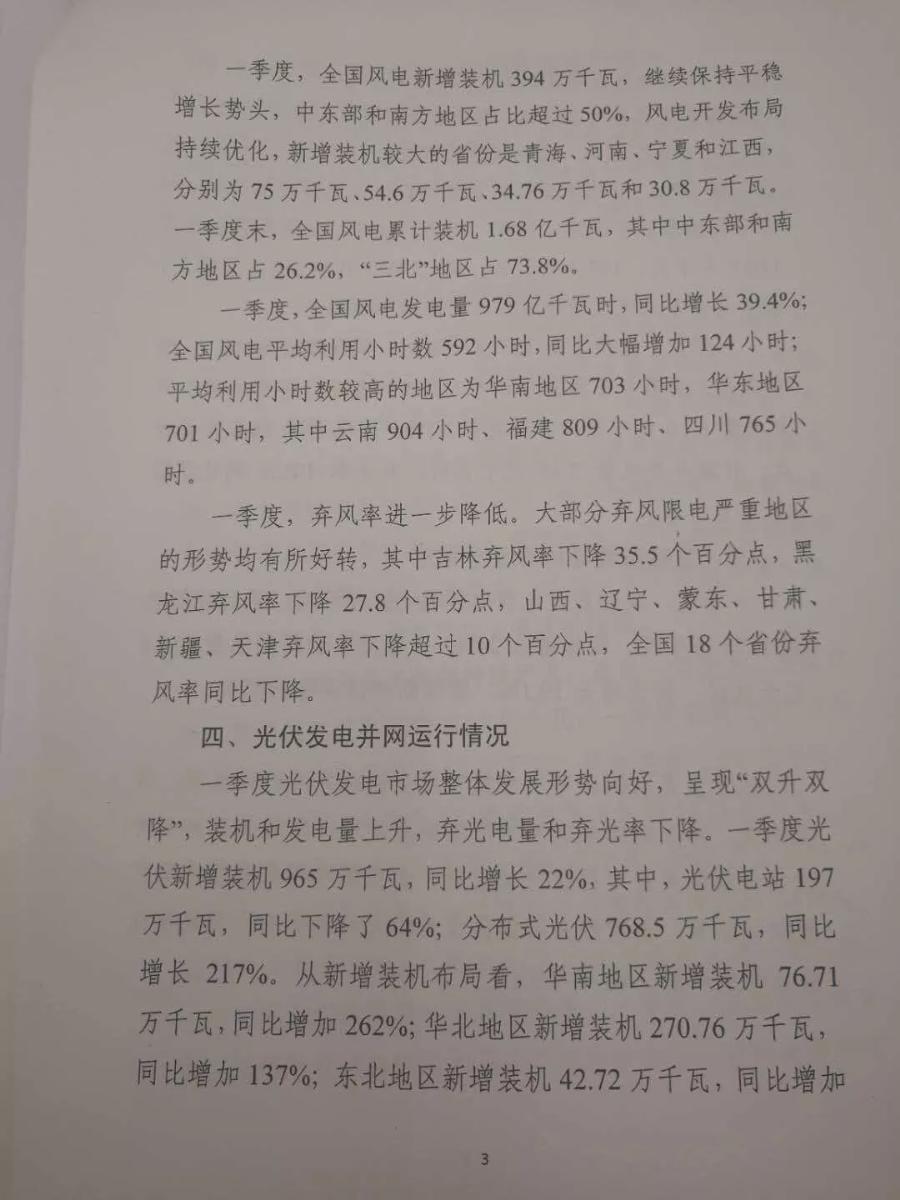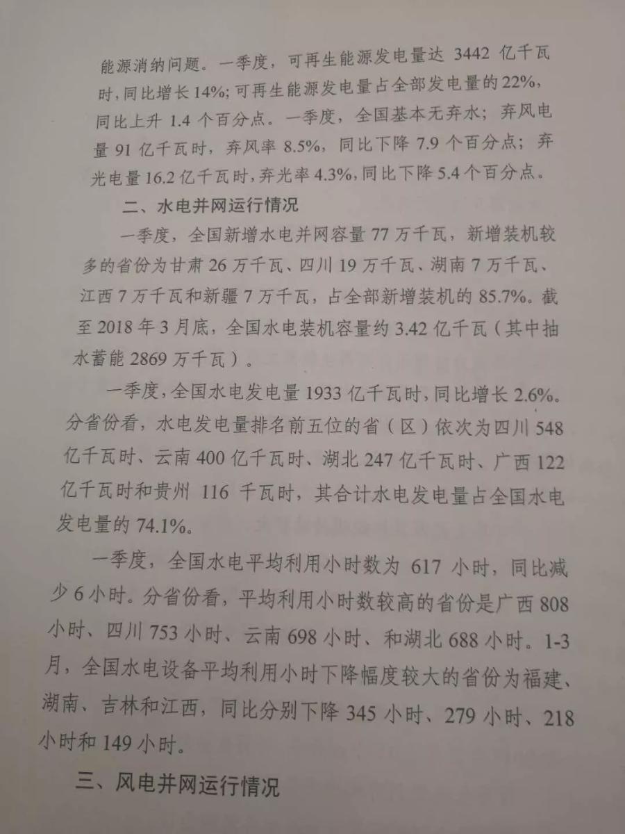 可再生能源利用水平顯著提高。一季度,可再生能源發(fā)電量達(dá)3442億千瓦時,同比增長14%;可再生能源發(fā)電量占全部發(fā)電量的22%,同比上升1.4個百分點。一季度,全國基本無棄水;棄風(fēng)電量91億千瓦時,棄風(fēng)率8.5%,同比下降7.9個百分點;棄光電量162億千瓦時,棄光率4.3%,同比下降54個百分點。