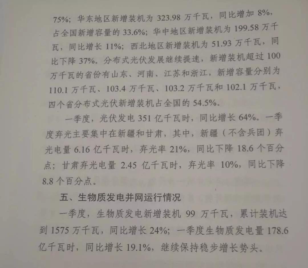 可再生能源裝機規(guī)模持續(xù)擴大。截至一季度末,我國可再生能源發(fā)電裝機達(dá)到6.66億千瓦,一季度新增1535萬千瓦;其中,水電裝機3.42億千瓦、風(fēng)電裝機1.68億千瓦光伏發(fā)電裝機1.4億千瓦、生物質(zhì)發(fā)電裝機1575萬千瓦,一季度新增分別為77萬千瓦、394萬千瓦、965萬千瓦和99萬千瓦??稍偕茉窗l(fā)電裝機約占全部電力裝機的36.9%比2017年提高了0.3個百分點,