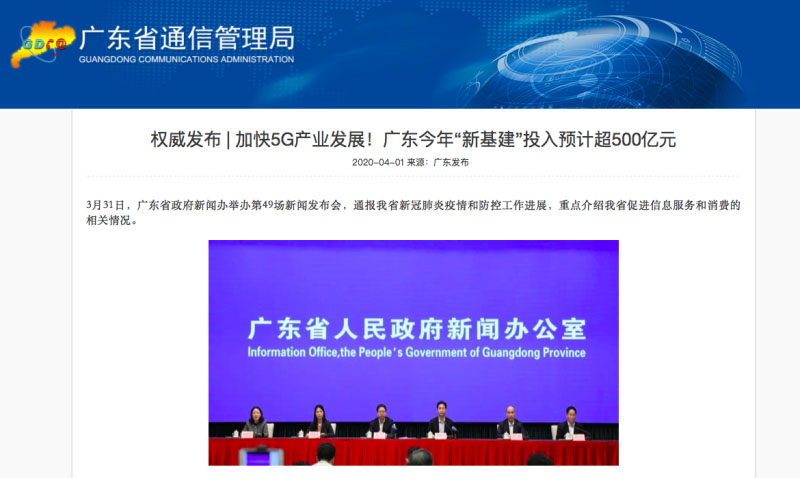 中國儲能網(wǎng)訊:在近日廣東省政府新聞辦舉辦的第49場新聞發(fā)布會上,廣東省工業(yè)和信息化廳副廳長楊鵬飛透露,目前,廣東正加快發(fā)展以5G為代表的新一代信息技術(shù)和新型信息基礎設施,2020年力爭新建6萬座5G基站;進一步完善鄉(xiāng)村信息基礎設施,推動個人、家庭、中小企業(yè)等網(wǎng)絡提速提質(zhì)降費,打好信息服務和消費網(wǎng)絡基礎;預計2020年廣東以5G和數(shù)據(jù)中心為代表的新型信息基礎設施投資將超過500億元。