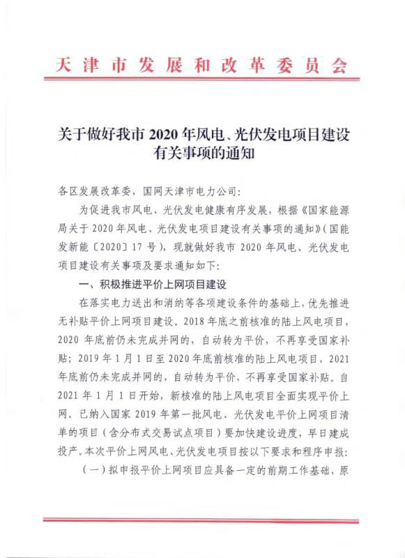 2020年4月1日,天津市發(fā)改委下發(fā)了《關(guān)于做好2020年風(fēng)電、光伏發(fā)電項(xiàng)目建設(shè)有關(guān)事項(xiàng)的通知》。根據(jù)通知要求,在落實(shí)電力送出和消納等各項(xiàng)建設(shè)條件的基礎(chǔ)上,優(yōu)先推進(jìn)無補(bǔ)貼平價(jià)上網(wǎng)項(xiàng)目建設(shè)。擬申報(bào)平價(jià)上網(wǎng)項(xiàng)目應(yīng)具備一定的前期工作基礎(chǔ),且應(yīng)開展電力接入和消納能力分析,具備接入和消納條件。