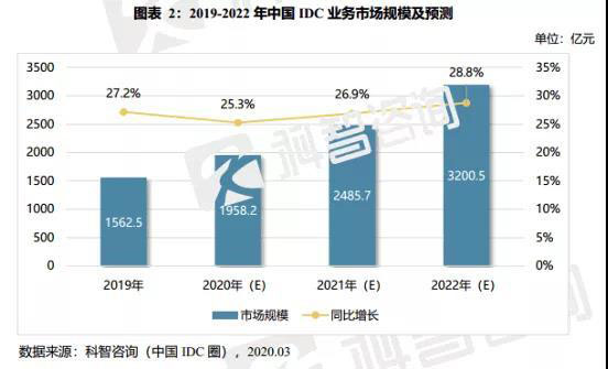 根據(jù)國內知名行業(yè)調研機構科智咨詢發(fā)布的《2019-2020年中國IDC產業(yè)發(fā)展研究報告》顯示,2019年,中國IDC業(yè)務市場規(guī)模達到1562.5億元,同比增長27.2%。預計2019-2022年,中國IDC業(yè)務市場規(guī)模復合增長率將達到26.9%。