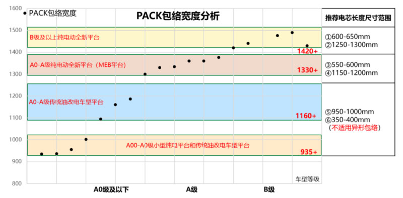 通過對當前市場上的主銷車型寬度進行分析,如1-1圖所示,主流的A0-A級,以及B級以上的平臺適用于長度1150mm-1300mm的長電芯,但如果都按照比亞迪“漢”所標配的1m或1m以上長度做電芯,勢必會顧此失彼,結(jié)果便是某款車可能匹配較好,另外一些就裝不下,或者空間不能得到有效利用,這就違背了提高空間利用率的初衷?!耙簿褪钦f,過長的尺寸會降低對市場主流乘用車的適配性和靈活性,從整車角度來看,我們?nèi)匀恍枰獮槠湔业揭粋€‘合適的’標準,這一點很重要。”楊紅新表示。