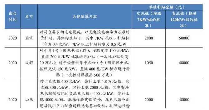 其實,在2020年開年后,充電樁列入新基建項目之前,北京、深圳、山東、成都已經(jīng)率先出臺了對充電樁建設的補貼扶持政策,按交流/直流、私樁/公樁劃分,單樁可得補貼從1050元-60000元不等。若以15萬元一個的大功率直流充電樁舉例,補貼落地后最高可覆蓋其40%的建設成本,將極大改善建樁的高成本問題。