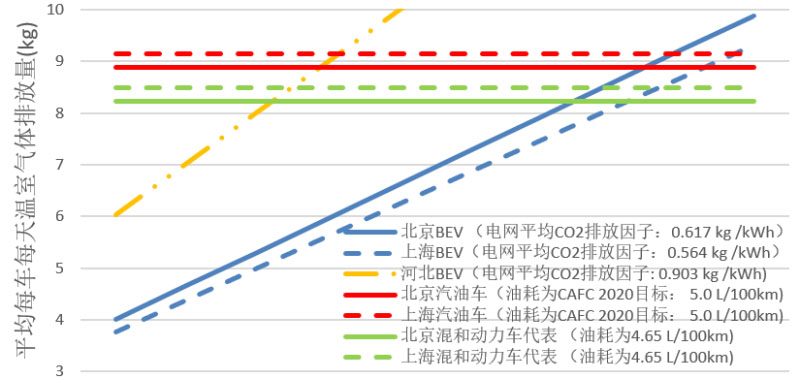 插電式混合動力車由于沒有續(xù)航里程約束,最佳里程就是與傳統(tǒng)混合動力汽車和能夠達(dá)到2020年油耗標(biāo)準(zhǔn)的燃油車相比,其溫室氣體排放更少的里程,也是低于凈利益點的里程。