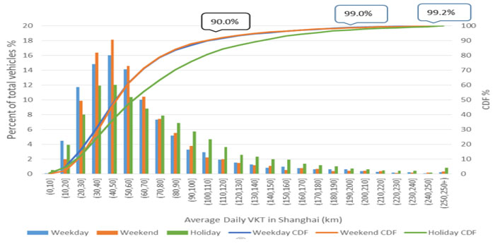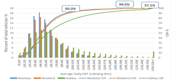 根據(jù)北京的近4萬臺燃油車及上海的約5千臺插電式混合動力車的實際出行里程數(shù)據(jù),可以發(fā)現(xiàn)車輛的續(xù)駛里程跟實際居民需要的里程是有差距的。