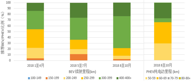 2018年國家取消了對250km以下車型的補(bǔ)貼。根據(jù)加州大學(xué)的一項“2018前10個月推薦BEV/PHEV 純電動里程所占比例比較”研究發(fā)現(xiàn),截止到2018年10月末,工信部發(fā)布的新能源車型目錄中,近80%的純電動車型續(xù)駛里程都已超過300km,續(xù)駛里程在300-399km的純電動車型比例(綠色柱形),從2018年4月起呈現(xiàn)逐月增加的趨勢,很明顯是受到了政策的影響。