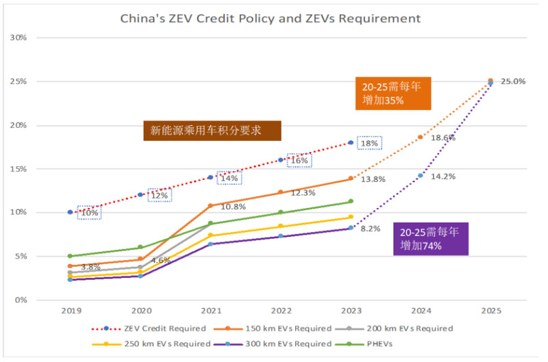 如果是像特斯拉Model 3、蔚來這種續(xù)航里程超過300km、積分比較高的車(紫色折線),車的數(shù)量并不多就能滿足積分需求,但要達(dá)到25%占有率的目標(biāo),則需要每年數(shù)量增長74%,這種增長非常困難。
