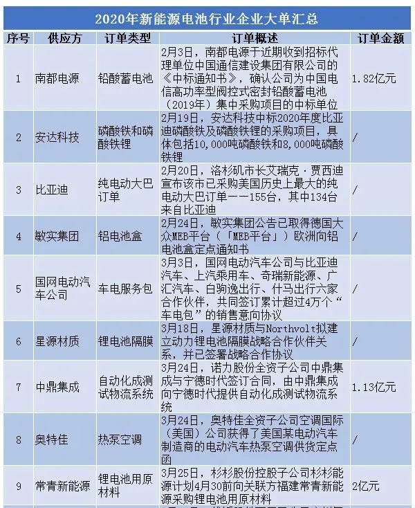 電池網(wǎng)(微號:mybattery)統(tǒng)計(jì)發(fā)現(xiàn),2020年,已有南都電源、安達(dá)科技、比亞迪、敏實(shí)集團(tuán)、國網(wǎng)電動汽車公司、星源材質(zhì)、中鼎集成、奧特佳、常青新能源、雄韜股份、華友鈷業(yè)、贏合科技等企業(yè)收獲訂單。