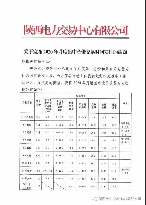 陜西:關(guān)于發(fā)布2020年月度集中競(jìng)價(jià)交易時(shí)間安排的通知