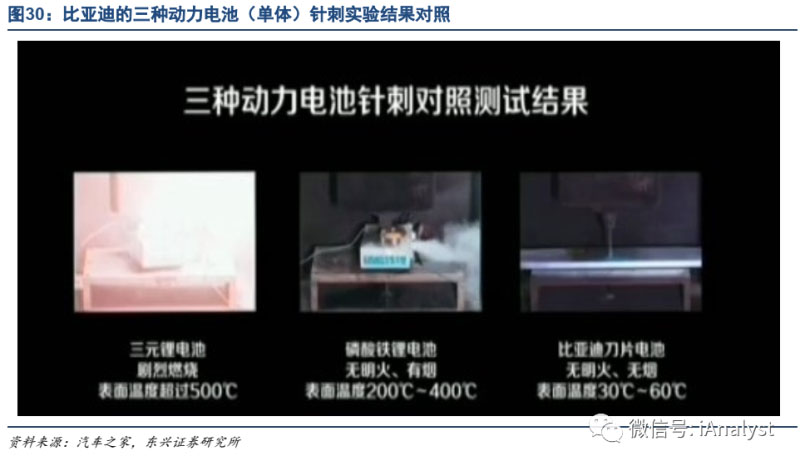 據(jù)汽車之家2020年3月24日報道,比亞迪實驗室對其生產(chǎn)的三元鋰離子電池、磷酸鐵鋰離子電池、刀片電池(磷酸鐵鋰)分別按照GB/T 31485-2015的針刺試驗方法開展針刺實驗。實驗結(jié)果表明,方形三元鋰離子電池在針刺過程中溫度迅速升高,促使材料分解,氣體沖開泄壓閥,并有明火,隨后發(fā)生爆炸,表面溫度超500℃;方形磷酸鐵鋰動力電池在針刺實驗中溫度升高,內(nèi)部產(chǎn)生氣體重開泄壓閥,但無明火,表面溫度200-400℃;刀片電池(磷酸鐵鋰)在針刺實驗中無明火、無煙,無大量氣體,表明溫度僅30-60℃。如圖30所示。磷酸鐵鋰刀片電池的技術(shù)極大地改善了動力電池安全性能,并提升了能量密度和體積密度。