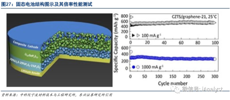 動力電池自燃主要是電解液中可燃物燃燒所致,固態(tài)電池直接使用固態(tài)電解質(zhì),極大改善了動力電池的熱穩(wěn)定性能,固態(tài)電池產(chǎn)業(yè)化之路也在不斷探索中。中科院寧波材料技術(shù)與工程研究所官網(wǎng)2016年12月7日發(fā)布文章稱,寧波材料所固態(tài)鋰離子電池團隊姚霞銀副研究員領(lǐng)導(dǎo)的小組設(shè)計了一種新型的固態(tài)電池結(jié)構(gòu),實現(xiàn)了金屬鋰負極在固態(tài)電池中應(yīng)用,并且倍率性能優(yōu)異,如圖27所示。
