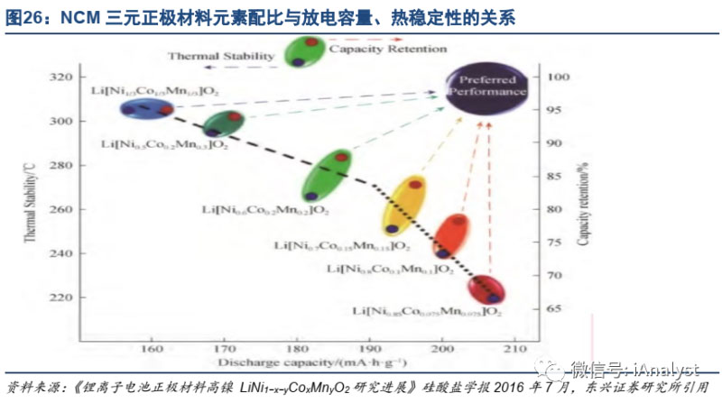 為了實現(xiàn)動力電池更高的能量密度和新能源汽車更長的續(xù)航里程,具有更高能量密度的三元高鎳正極(鎳金屬含量高的鎳鈷錳酸鋰/鎳鈷鋁酸鋰)等正極材料受到關(guān)注。近年來國內(nèi)高鎳三元正極材料的出貨比例有所提升,NCM622、NCM811、NCA的銷量合計占比已經(jīng)從2016年的12%增長至2018年23.07%,這在一定程度上促進了動力電池新能的提升,三元正極材料配比與放電容量關(guān)系如圖26所示。