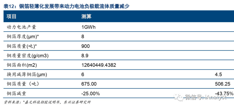 根據(jù)銅箔厚度不同,可以分為極薄銅箔(≤6μm)、超薄銅箔(6-12μm)、薄銅箔(12-18μm)、常規(guī)銅箔(18-90μm)和厚銅箔(>70μm)。銅箔作為鋰離子電池的負極載流體,其厚度、性能對電池的重量以及能量密度有較大影響。目前中國鋰電銅箔以8μm為主,部分企業(yè)已經(jīng)在推進6μm銅箔的量產(chǎn)和商業(yè)化應(yīng)用。在控制其他因素(正負極材料、涂布厚度等)不變的情況下,1GWh的動力電池使用的銅箔的面積一定的,8μm銅箔改用6μm銅箔將減輕負極載流體25%的重量,而換用4.5μm的銅箔則能減重負極載流體43.75%的重量,從而提升能量密度。如表12所示。