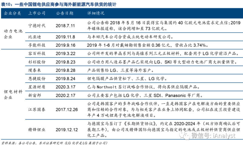 第三方采購角度看,已經(jīng)進入海外新能源汽車產(chǎn)業(yè)鏈的企業(yè)有望迎來業(yè)務(wù)量的增長。主要包括直接參與和間接參與,直接參與主要是寧德時代等企業(yè)直接供應(yīng)相應(yīng)車企,間接參與主要是指國內(nèi)鋰電材料企業(yè)通過供應(yīng)動力電池廠商進入海外車企供應(yīng)鏈。國內(nèi)動力電池產(chǎn)業(yè)公司在海外車企的供應(yīng)鏈方面的參與情況如表10所示。