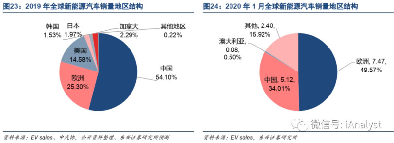 如前文所述,歐洲或?qū)⒊蔀槿蜃畲蟮男履茉雌囀袌觯瑸閯恿﹄姵禺a(chǎn)業(yè)帶來重要增量需求。Inside EVs和EV sales數(shù)據(jù)表明,在2020年1月全球新能源汽車銷量下滑7%的情況下,歐洲市場逆勢增長121%,領(lǐng)跑全球。2019年和2020年1月全球新能源汽車銷量地區(qū)結(jié)構(gòu)如圖23和圖24所示。