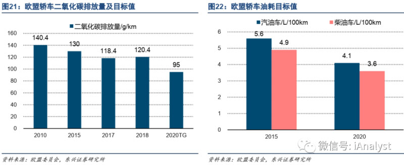 根據(jù)《歐洲議會和理事會第(EU)2019/631號條例》(下稱“條例”)相關(guān)規(guī)定,條例規(guī)定,2020年車企新登記轎車中至少95%需達到95g/km的CO2排放控制目標,2021年起所有新登記轎車的CO2平均排放需低于95g/km。據(jù)該官網(wǎng)數(shù)據(jù),2018年歐盟和冰島新登記的轎車平均CO2排放量為120.4g/km,95g/km的新要求較其降低21.1%,對應(yīng)大約4.1升/100km的汽油消耗或3.6升/100km的柴油消耗,如圖21和圖22所示。碳排放法規(guī)的趨嚴將帶來新能源汽車銷量和動力電池需求的增長。