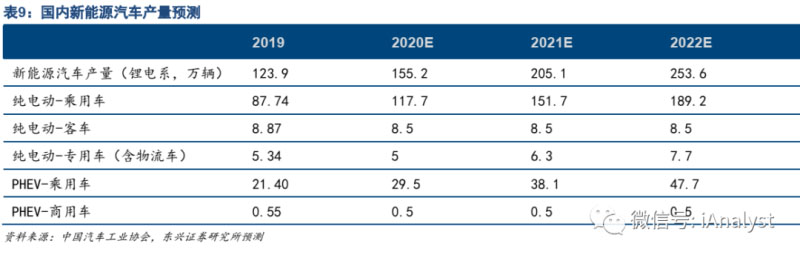 根據(jù)國內(nèi)政府規(guī)劃、外資新車型投放進度、雙積分要求等,我們測算了2020-2022年國內(nèi)新能源汽車產(chǎn)量分別為155.2萬輛、205.1萬輛、253.6萬輛。如表9所示。