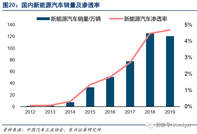 國內(nèi)方面,據(jù)中國汽車工業(yè)協(xié)會數(shù)據(jù),2019年國內(nèi)新能源汽車銷量120.6萬輛,在2,576.9萬輛的汽車銷量中占比僅4.68%,如圖20所示。新能源汽車行業(yè)空間廣闊,將帶動動力電池需求持續(xù)增長。工信部官網(wǎng)2019年12月3日發(fā)布《新能源汽車產(chǎn)業(yè)發(fā)展規(guī)劃(2021-2035年)》(征求意見稿),提出2025年國內(nèi)市場新能源汽車銷量占比要達到25%。市場成長空間巨大。