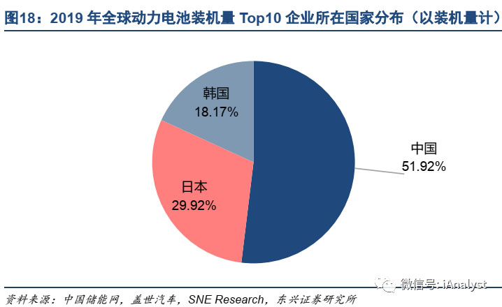 全球動力電池行業(yè)競爭格局已經(jīng)較為集中。2019年國內(nèi)和全球動力電池行業(yè)前十廠商占據(jù)86.88%的份額。全球動力電池裝機量前十的企業(yè)看,主要是中國、韓國和日本的企業(yè),出貨量前十動力電池企業(yè)所在國家分布如圖18所示。