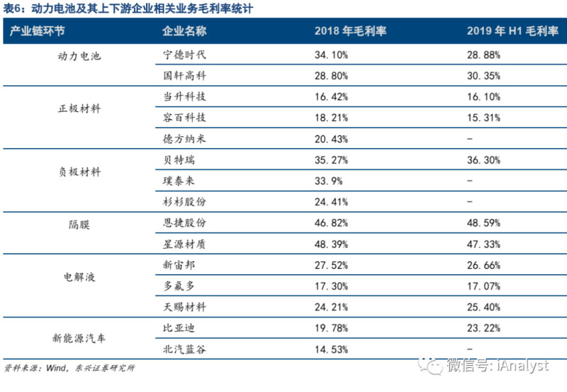 動力電池在產(chǎn)業(yè)鏈中具有較高的議價能力。對于上游鋰電材料供應(yīng)商而言,因為供需格局和技術(shù)壁壘的問題,一般會被動力電池廠商壓低價格,因此毛利率較低。而對于下游整車廠而言,即將到來或者已經(jīng)在實施的政策帶來的壓力下,發(fā)展新能源汽車是剛性任務(wù)。雖然動力電池行業(yè)產(chǎn)能過剩,但更多的是結(jié)構(gòu)性的過剩,符合車廠需要、有一定競爭力的動力電池對車廠而言相對稀缺。比如近期有外媒報道,捷豹、奧迪等車企因為LG歐洲工廠產(chǎn)能不足不得不推遲新車型量產(chǎn)計劃,或降低產(chǎn)量預(yù)期。優(yōu)質(zhì)的動力電池企業(yè)無論是對上游還是下游,都具有較強的議價能力,處于重要且較為強勢的地位。我們從不同環(huán)節(jié)企業(yè)的毛利率水平可以看出這一特征,如表6所示。