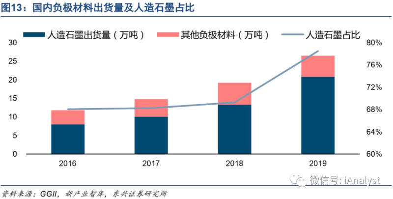 技術(shù)路線方面,人造石墨占據(jù)了行業(yè)主流。當前主要使用的負極材料是石墨類材料,一般的天然石墨因為價格低仍有部分需求,人造石墨因為良好的循環(huán)性能、倍率性能、安全性能,備受關(guān)注,已經(jīng)成為當前負極材料領(lǐng)域主流。數(shù)據(jù)顯示,全國使用的負極材料中人造石墨的占比不斷提升,2019年已經(jīng)達到78.49%。如圖13所示。硅碳負極是下一代負極材料,需要相應(yīng)的高能量密度正極材料與之相匹配,并且硅碳負極面臨硅顆粒容易膨脹等問題。
