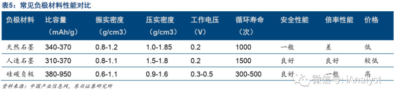 目前常用的負極材料主要是石墨類材料,包括天然石墨、人造石墨、硅碳負極、中間相碳微球等。不同材料優(yōu)勢各不相同,人造石墨因其良好的倍率、循環(huán)性能以及較低的價格獲得了更多市場份額。不同負極材料的性能對比如表5所示。